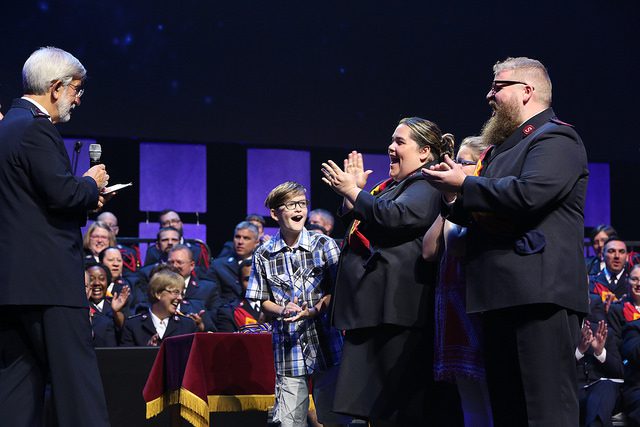 The congress was filled with music, including performances by British Salvationist Charlie Green and some of the territory’s premier groups, such as the world-renowned Chicago Staff Band (CSB), a territorial youth band and youth chorus, and the territorial praise band, The Singing Company. Some groups were formed especially for the event, including a united singing company of more than 250 children who represented every division. Many of the meetings featured the territory’s Bill Booth Theater Company which—with the CSB—gave a preview of a Broadway-style musical, A Long Way Off, being written by Joe Caddy and Phil Laeger to debut next year.