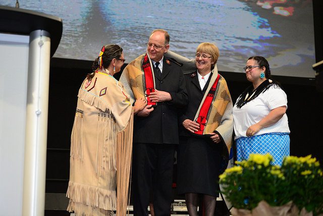 In a welcome celebration, indigenous officers from the region with Major Shari Russell, Territorial Indigenous Ministries Consultant, presented gifts to the international leaders and Territorial Commander Commissioner Susan McMillan. As a gesture of love and friendship, the General and Commissioner Cox were wrapped in a blanket that represented a traditional buffalo robe.