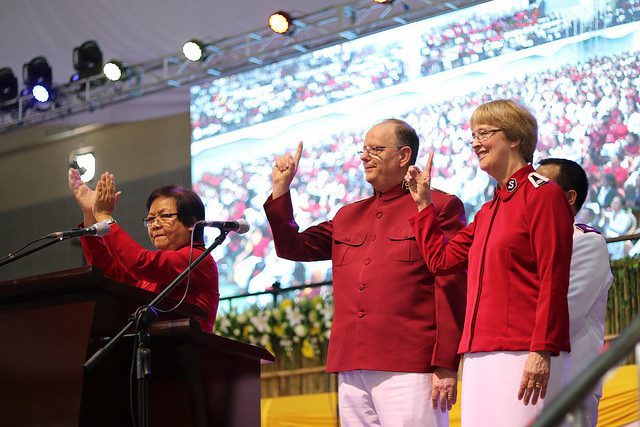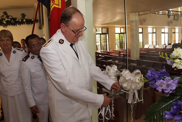 The international leaders wore red uniforms for the centenary flame-lighting ceremony, in recognition of the red uniforms worn by the pioneer officers who introduced The Salvation Army to the people of Mizoram.