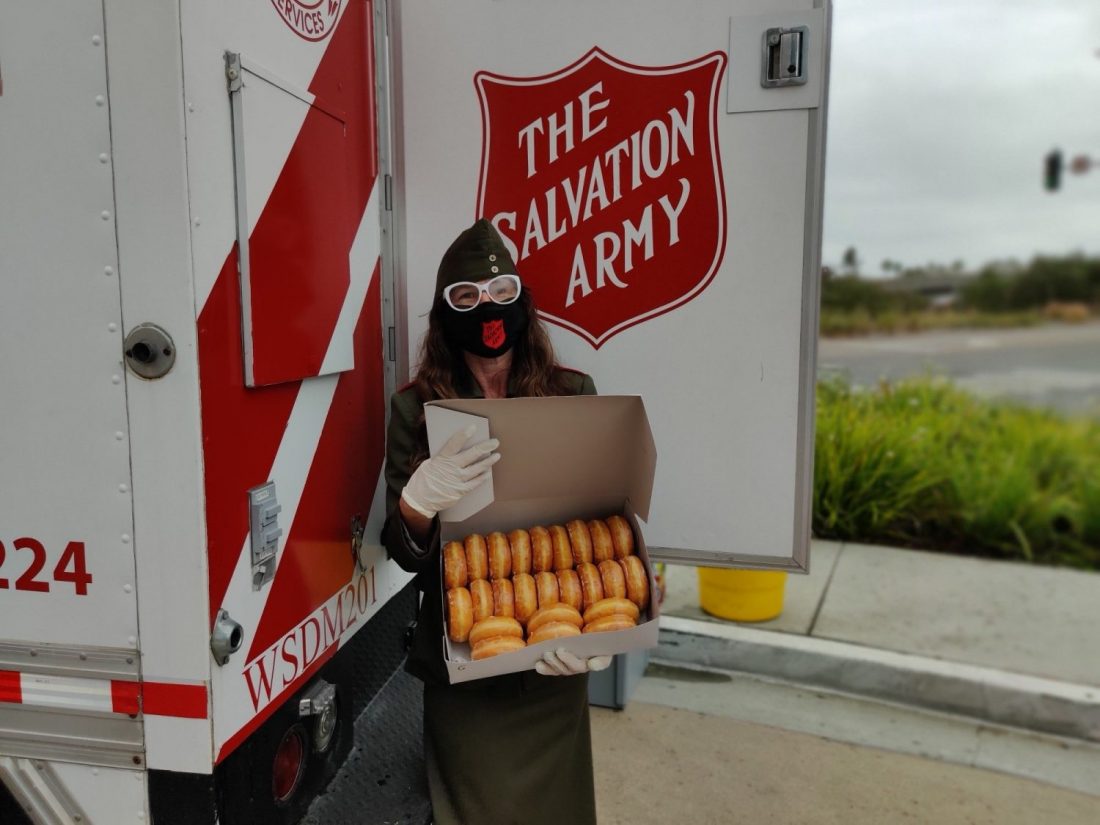 “Doughnut day is a celebration of these courageous [doughnut lassies] and those courageous young men in uniform who fought so bravely. Today, there are other men and women in uniform fighting a life or death struggle across the globe, and once again, The Salvation Army is there alongside them,” said California South Divisional Commander Lt. Colonel John Chamness in a video message. “Yes, we will still bring people doughnuts, but we have also brought more than 2.5 million nutritious meals to hungry families and vital N-95 masks to frontline workers. This Doughnut Day, let’s celebrate the heroes in a different kind of uniform—the doctors and nurses and first responders who are fighting and winning this war against COVID-19.”