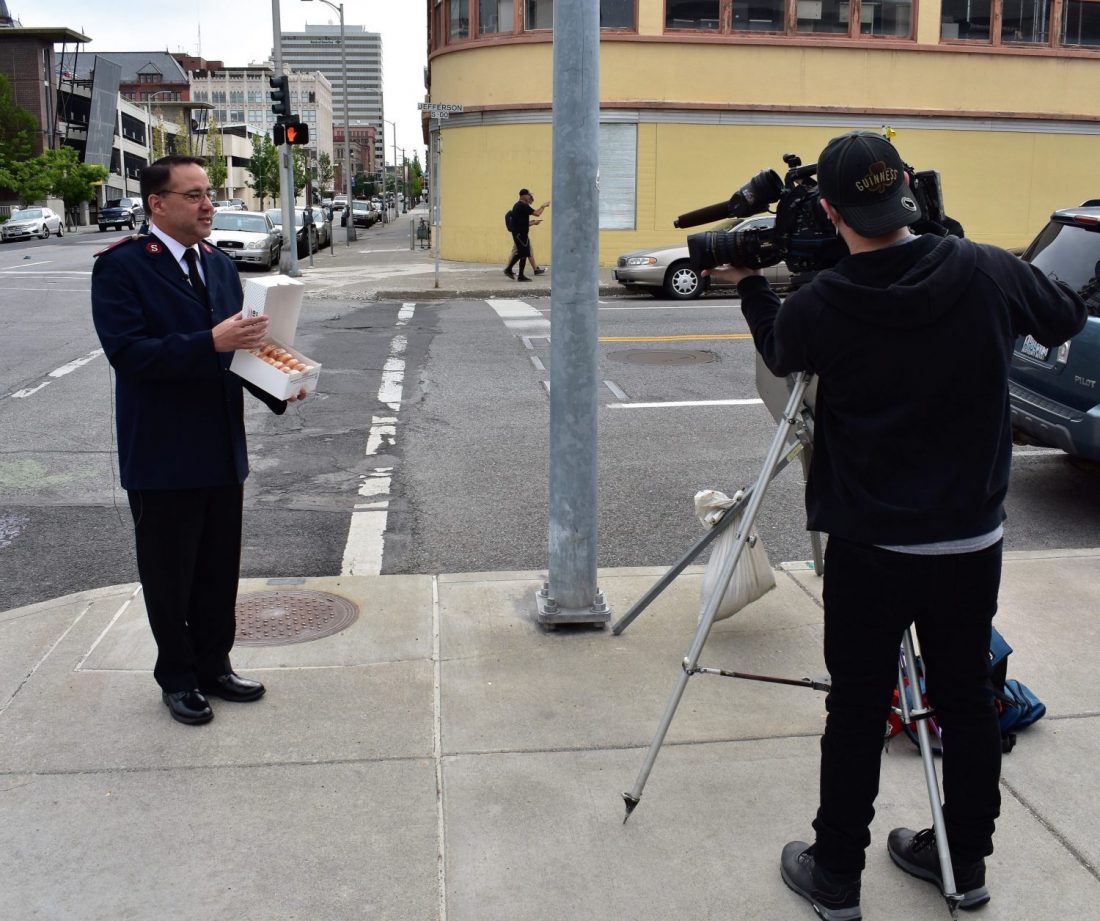 For National Donut Day, Major Ken Perine and Lt. Chase Tomberlin-Green from The Salvation Army of Spokane, Washington, delivered doughnuts to first responders—including members of the Spokane Fire Department and Police Department—and the media; these individuals have served on the front lines during the COVID-19 pandemic. Perine was interviewed by one TV station and two radio stations.
