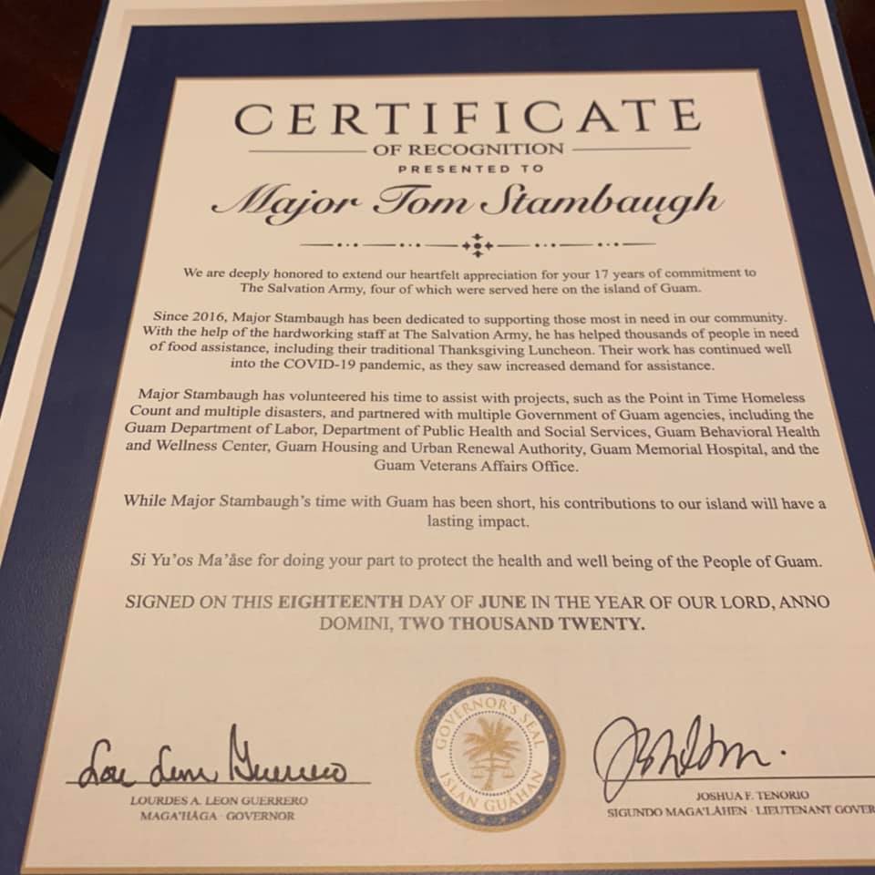 “We are more than grateful, overwhelmed and blessed for being recognized, but as I told the Governor it is out of our calling and love for God, and most important it’s the Guam team that makes it all possible,” Thomas Stambaugh said.