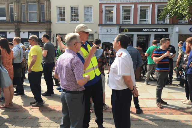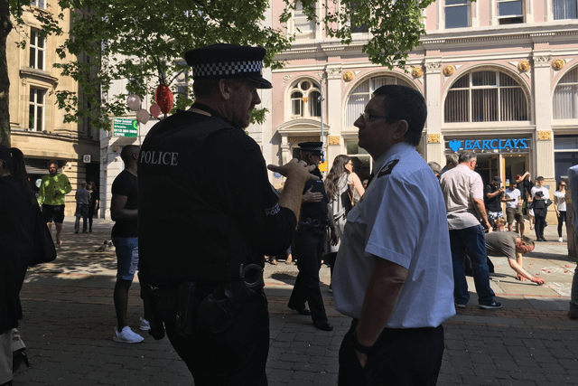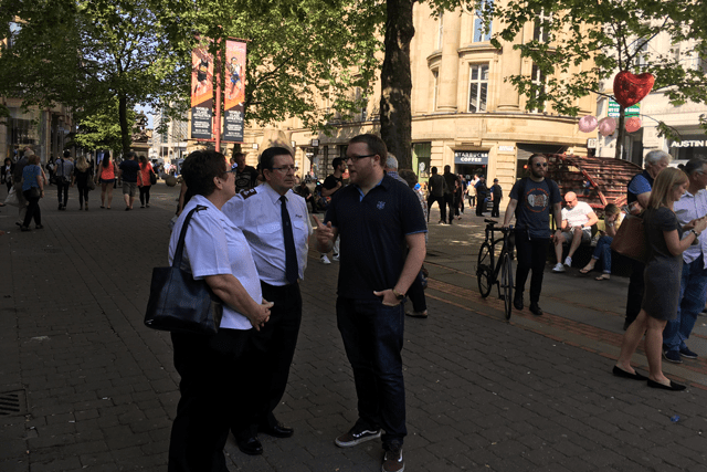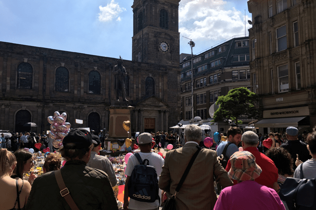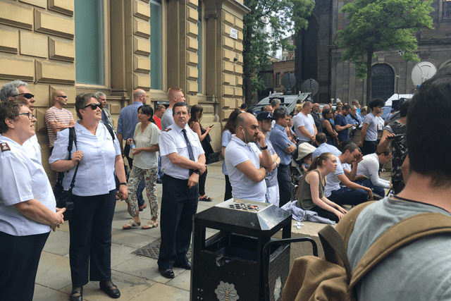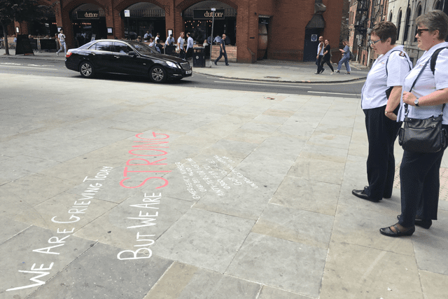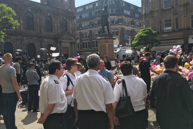 A further Salvation Army presence—intended to provide reassurance and comfort—was evident at St. Ann’s Square in the city, which has become a focal point for people mourning and paying tribute to those who were killed.