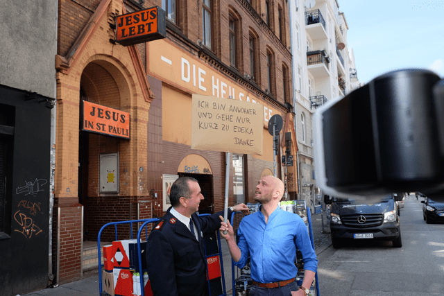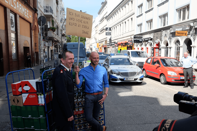 Amid blanket coverage of protests, one photograph that went viral showed a young man walking past the security forces, holding a sign that said: “I’m a resident and I’m just going to EDEKA, Thanks.” EDEKA (a large grocery store chain) responded on Facebook by saying: “Stay home. We’ll bring you something. Please.” The man in question, German comedian Andre Kramer, thanked them for the offer but asked that they instead make a donation to the food bank and day center run by The Salvation Army in the city.